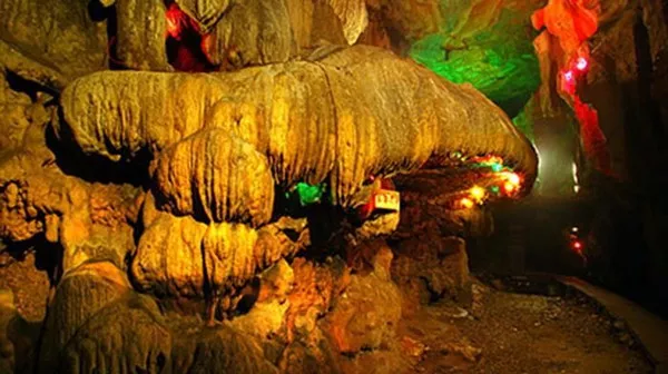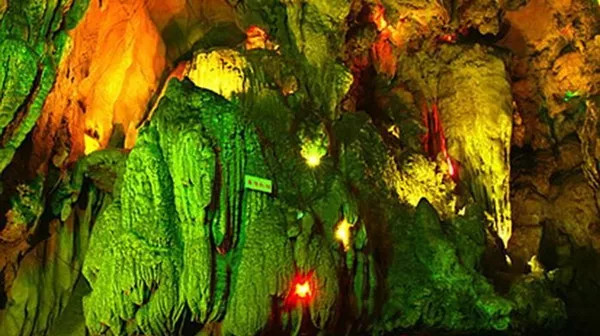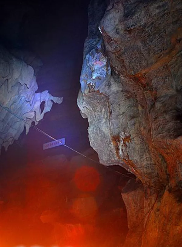 位于古戰(zhàn)場山腳下,巖洞有兩扇石門,進(jìn)入第一扇石門的右邊有菩薩,進(jìn)入第二扇門,走上99級臺階,便是巖洞平面,最寬處有2畝多,總長2公里。洞內(nèi)石筍林立,形態(tài)各異。有一池塘碧波蕩漾,清澈見底。