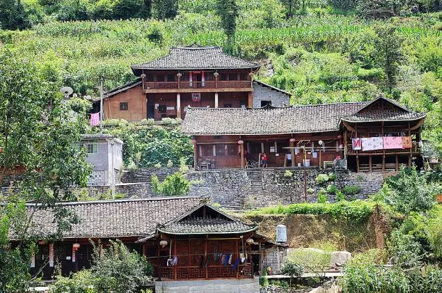 黔江小南海鎮(zhèn)板夾溪十三寨,由13個(gè)坐落在板夾溪兩岸的土家院落組成,生活著200多戶土家人,2013年被列為中國(guó)傳統(tǒng)古村落。山寨建筑多為吊腳木樓,依山就勢(shì)、竹樹掩映。這里終年都有錦雞、白鶴、山羊、猴群出入其間,而獨(dú)具一格的十三寨就坐落在這里。