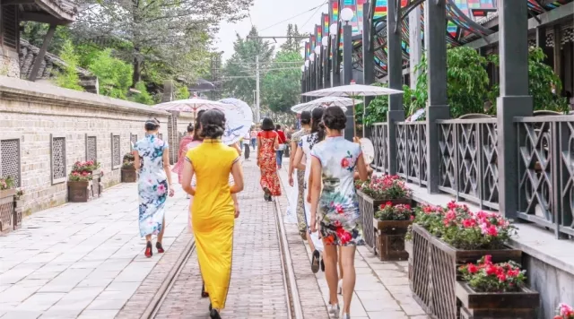 極具歷史感的鐺鐺車,是時(shí)代劇里不可缺少的一角。只要司機(jī)踩一下踏板,掛在車頭的銅鈴鐺就會(huì)發(fā)出“鐺鐺”的聲響,提醒行人避讓車輛。車軌全長(zhǎng)共2公里,連接著古鎮(zhèn)與劉氏莊園。走累了,可以乘著它慢慢悠悠的繼續(xù)瀏覽古鎮(zhèn)的美景。不同于千篇一律商業(yè)古鎮(zhèn)的仿古建筑,這里的老派建筑、電軌車轍,青石板的石縫以及街道酒肆中,都一點(diǎn)點(diǎn)的滲透出濃郁的歷史厚重感。