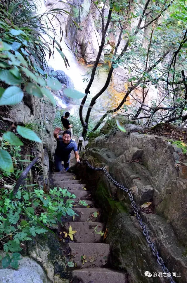 游過水簾寺、大雄寶殿、彌勒殿,經(jīng)同歸蓮華門,過白石橋,行至水簾洞下。常年的瀑布飛濺,谷底集水成潭,潭名浴龍?zhí)叮端宄好髁?,魚戲娃游。站在潭邊,任憑水花濺在臉上、身上,直覺涼風颼颼,神清氣爽。在谷底仰望水簾洞和水簾瀑布,有別是另般風情?!叭f古風云洞,千年雨露天。紅塵飛不到,高掛水晶簾?!彼邞野肟?,與世隔絕,與清風為伍,與白云作伴,真是神仙眷顧的地方!沿著古樸的石階