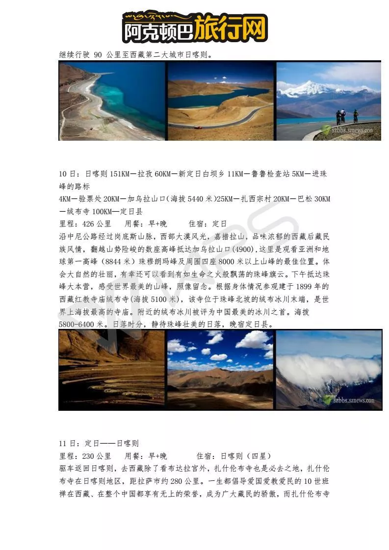 第七天:拉薩一日游(建議布達拉宮,大昭寺,八角街)第八天:拉薩—羊湖—卡若拉冰川江孜日喀則 第九天:日喀則絨布寺珠穆朗瑪峰自然保護區(qū)(大本營) 第十天:珠穆朗瑪峰自然保護區(qū)(大本營)—西夏幫馬峰--佩枯措薩嘎 第十一天:薩嘎—岡仁波齊—普蘭 第十二天:普蘭—扎達土林—托林寺—扎達 第十三天:扎達-古格遺址—帕羊仲巴 第十四天:仲巴—薩嘎—日喀則 第十五天:日喀則—拉薩