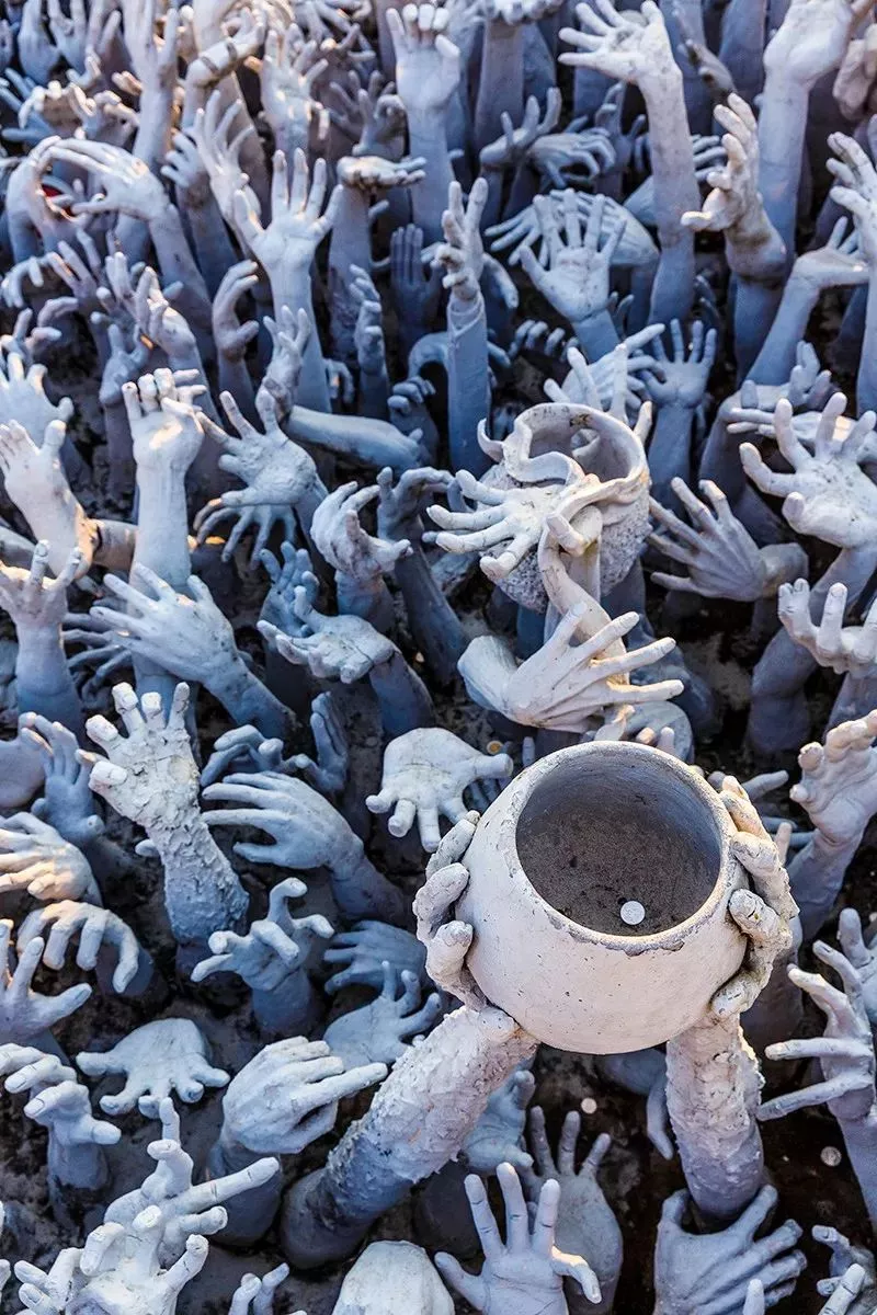 入口前放滿純白色卻又形象可怕的雕塑,凝造出地獄意境;過(guò)橋后通往白廟本殿,卻一瞬之間由邪轉(zhuǎn)善。殿內(nèi)墻壁一面畫(huà)有如煉獄般的邪惡魔鬼、災(zāi)難,更在不同角落中畫(huà)上眾多家喻戶曉的動(dòng)畫(huà)、電影角色,由皮卡丘、憤怒的小鳥(niǎo)、蝙蝠俠等帶出這個(gè)混亂世界的意思,令人印象深刻。向佛像伸延的左右兩邊墻上,畫(huà)有在佛教之中由惡轉(zhuǎn)善的人類,逐漸成仙成佛的救贖過(guò)程。殿內(nèi)禁止拍照,必須親眼細(xì)看。這座白廟其實(shí)尚未完工,庭園與側(cè)殿等地仍然處于施工狀態(tài),據(jù)說(shuō)整個(gè)工程要到2070年才能完工,但仍無(wú)減白廟的吸引力。