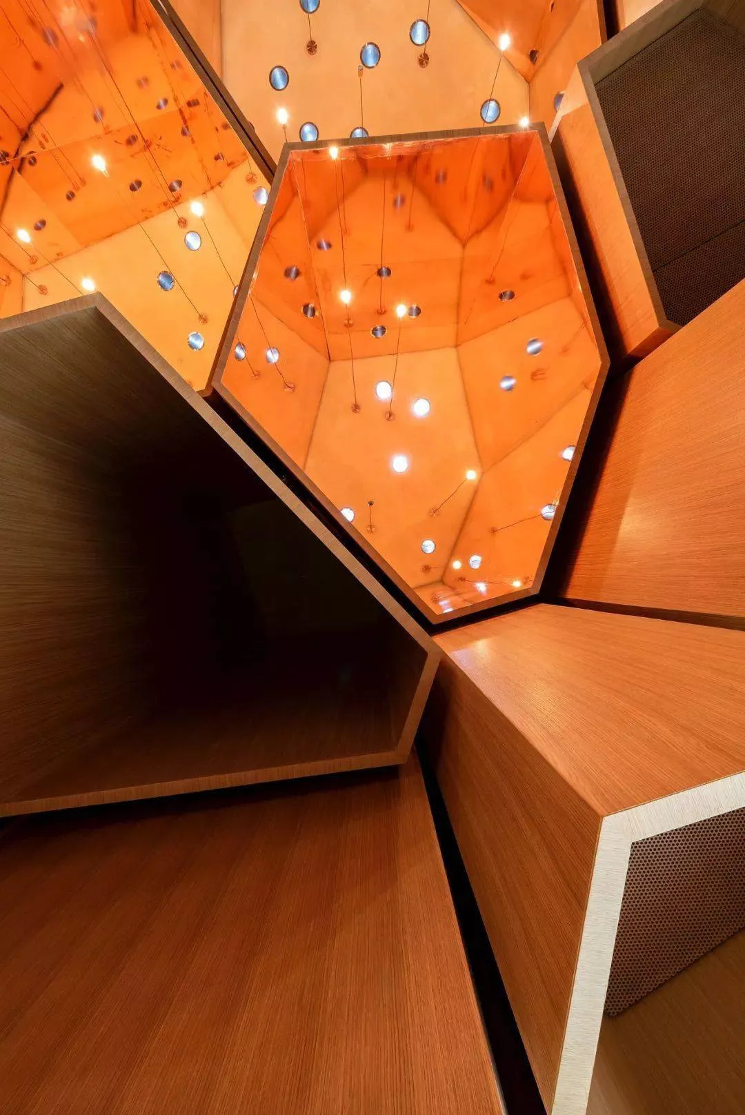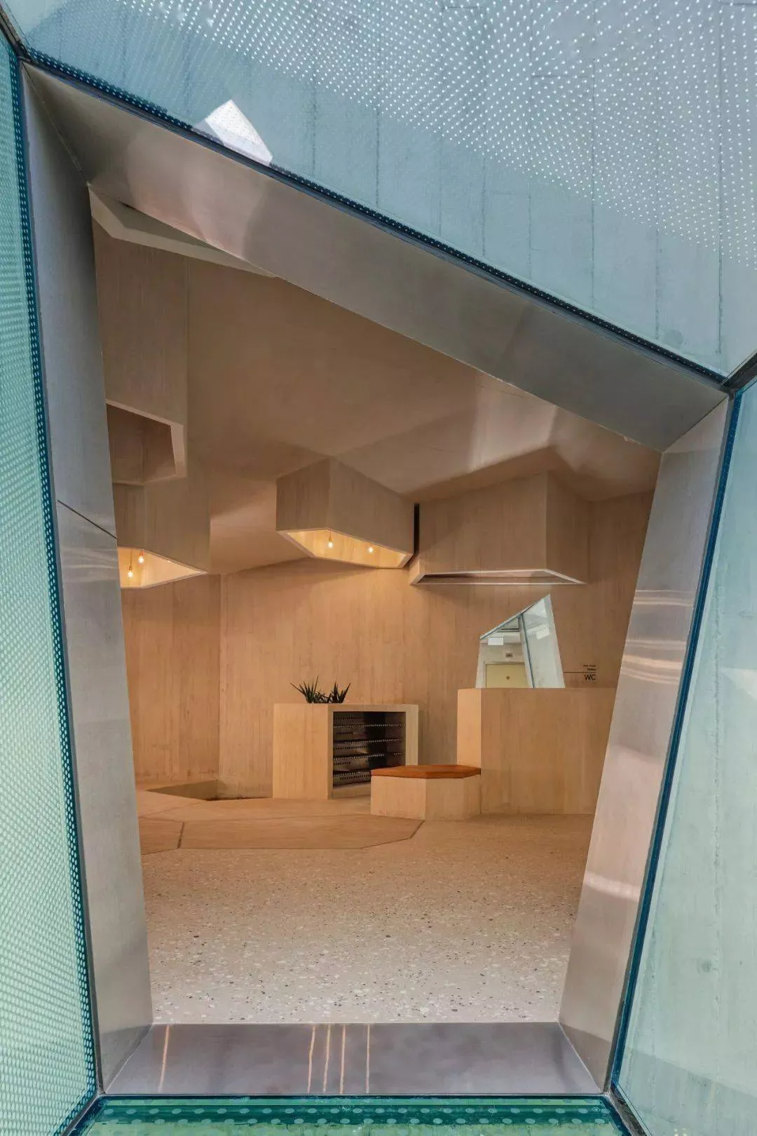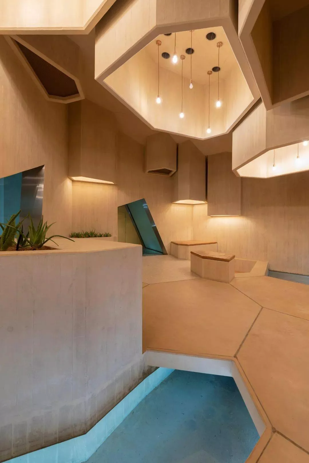 公園的幾何形狀在室內(nèi)設(shè)計中延續(xù)為吊頂設(shè)計,天花板上的圓形開口在其他封閉的空間內(nèi)點綴成了天窗。結(jié)合吊燈,它們以抽象的恒星形式出現(xiàn),讓人聯(lián)想到該地區(qū)的觀星導(dǎo)航。