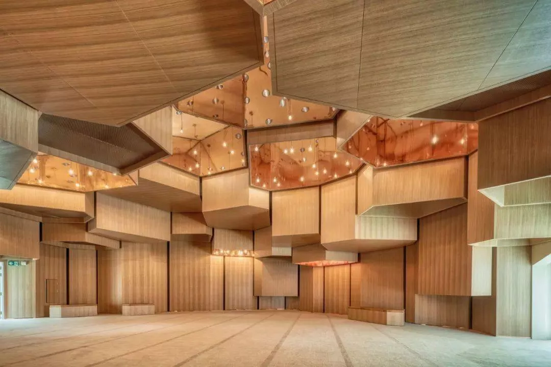 入口大廳和洗手間的混凝土天花板在祈禱大廳中與內(nèi)部鍍銅的木質(zhì)結(jié)構(gòu)形成鮮明對比,這形成了無盡的光線反射,將天花板的細節(jié)連接到了項目的整體方案中。