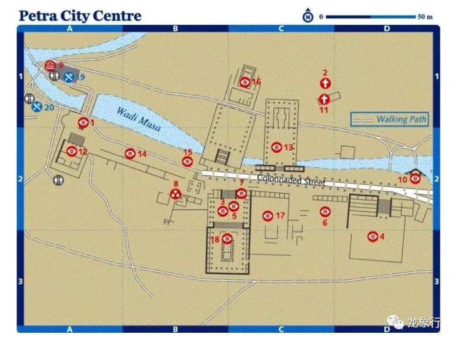 佩特拉古城城中心的主要遺址Petra City Center,包括下圖3/5/18集合Great Temple的建筑群、Qasr al-Bint(下圖12),好多遺址現(xiàn)在只剩下柱子。