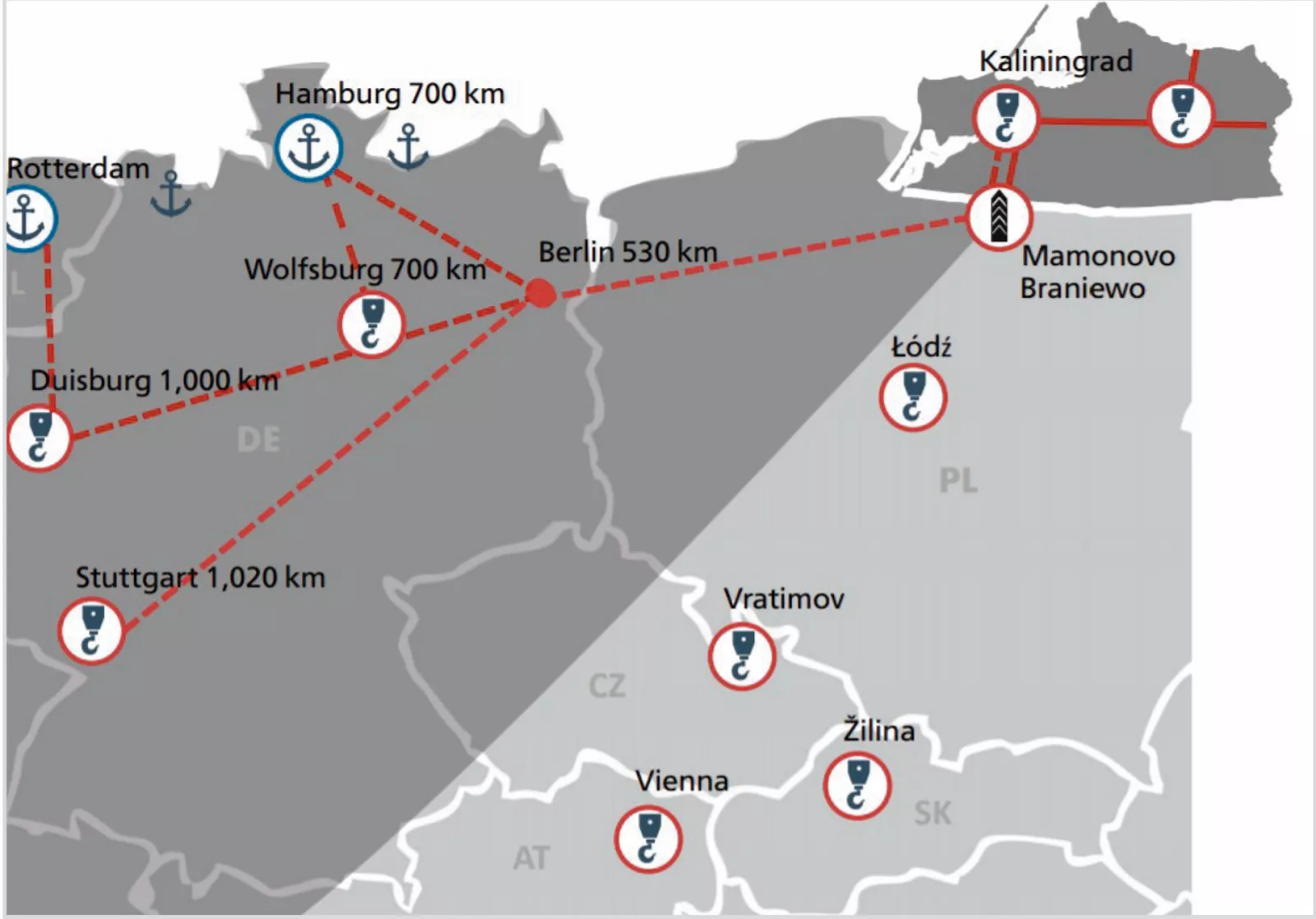 圖為加里寧格勒地區(qū)的交通基礎(chǔ)設(shè)施,其中藍(lán)色圖標(biāo)為海港,紅色柱狀圖標(biāo)為邊境鐵路口岸,紅色循環(huán)標(biāo)志為供貨物轉(zhuǎn)運(yùn)的鐵路場站,紅色虛線為標(biāo)準(zhǔn)軌鐵路,紅色實(shí)線為寬軌鐵路,藍(lán)線為海上航線。圖片來自:ERAI