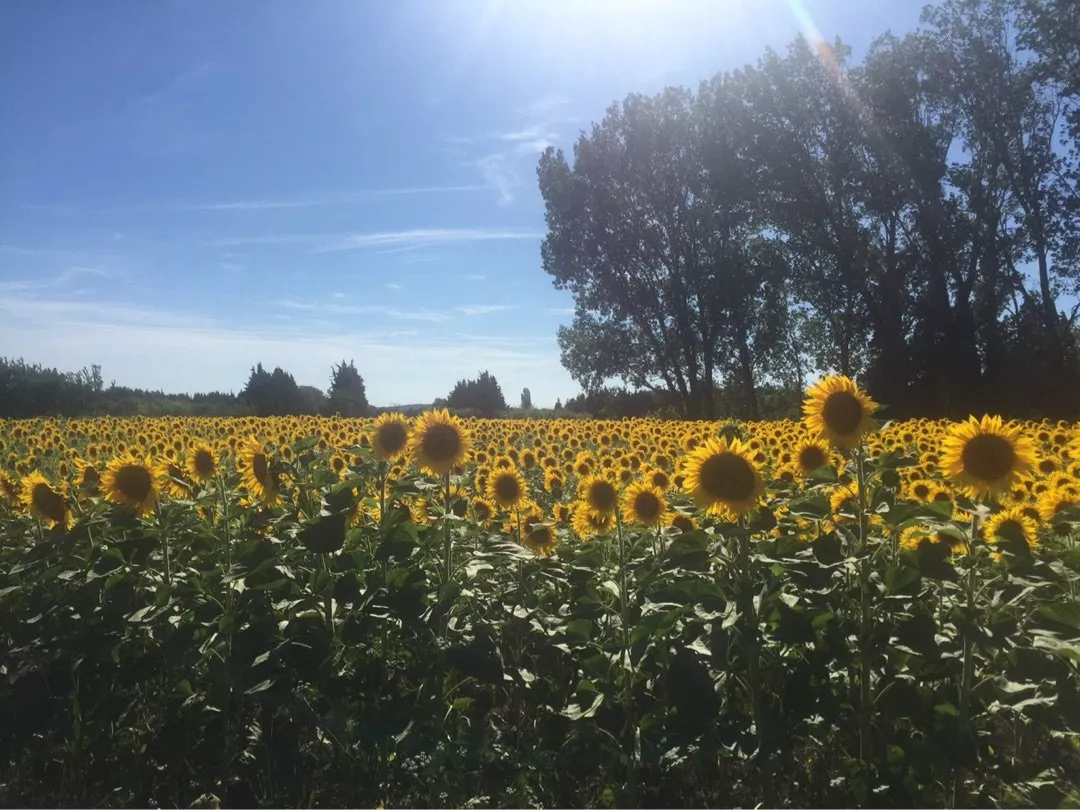 向日葵比薰衣草要晚些盛開。從六月底開始,法國南部的鄉(xiāng)間,到處能看到成片連綿的向日葵花田,一直持續(xù)1個月。每到盛夏,阿爾勒小城之外都有大片大片的向日葵在驕陽中綻放。田野會被這金色點燃,這就是梵高眼中、畫中炙熱的向日葵了。夏季短暫,向日葵的花期也不長。想要看花,步行到城外有些遠(yuǎn),在旅舍租輛自行車是最好的選擇。