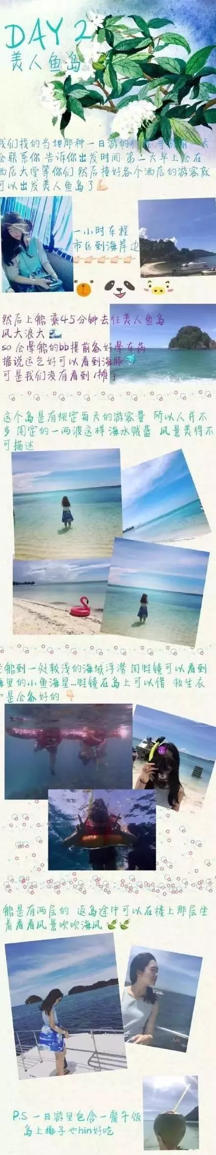 美人魚島是限定人數(shù)登陸,沙子超級白,特別細(xì),平時人少,所以到處都是特別小的白螃蟹。在島上浪漫的事就是夜晚在海邊尋找特有的“藍(lán)眼淚”--發(fā)著藍(lán)色微光的小生物,埋在沙里,放在掌心就像捧著一顆星星,最多的時候,整個沙灘都是藍(lán)色的,有著無法想像的浪漫。