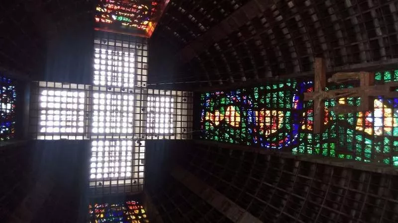 在里約市中心的天梯大教堂是當(dāng)局為慶祝里約教區(qū)建立300周年而修建的。它的外觀(guān)是非常前衛(wèi)的錐形造型,完全不同于一般傳統(tǒng)的天主教堂,而內(nèi)部則由四種不同顏色的強(qiáng)化塑膠板拼成四幅巨大的彩繪墻壁,通向十字架型天花板。踏入教堂大門(mén),抬起頭便可仰望懸掛在教堂正中的巨大受難圣像,令人肅然起敬。神壇后方有黑色圣母木雕,為當(dāng)?shù)?a href='/yumin49/' target=_blank>漁民出海討生活之保護(hù)神(類(lèi)似臺(tái)灣媽祖)。