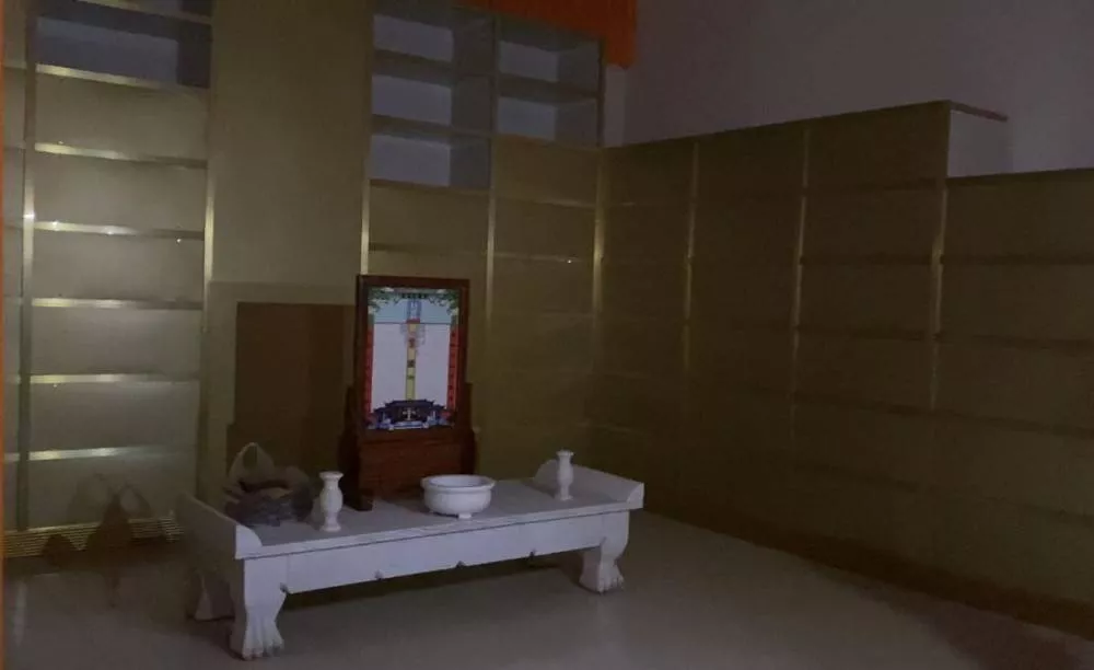 骨灰堂看守人介紹,掛了殯花和匾額的就是已經(jīng)把骨灰遷進(jìn)來的,家人每年清明會(huì)來祭拜一次;空著的房間是已經(jīng)賣掉但還沒有遷入。