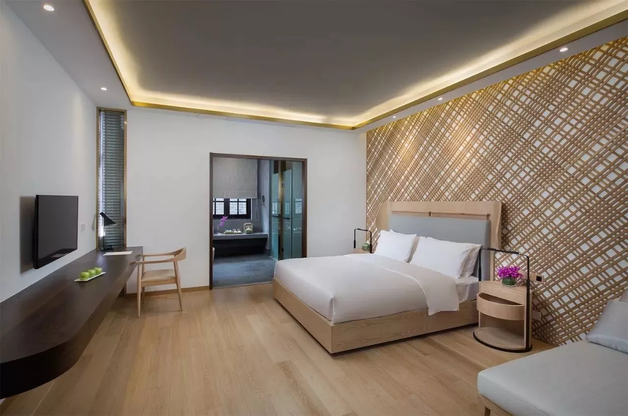 雖沒有繁復(fù)沉重的老舊物件,但若細看,會發(fā)現(xiàn)每個房間都各有其主題,竹編、剪紙、刺繡,三大中國傳統(tǒng)手工藝以抽象且自然的方式融入到房間之中,典雅的中國風(fēng)元素使寬敞的客房多了一絲獨特韻味。