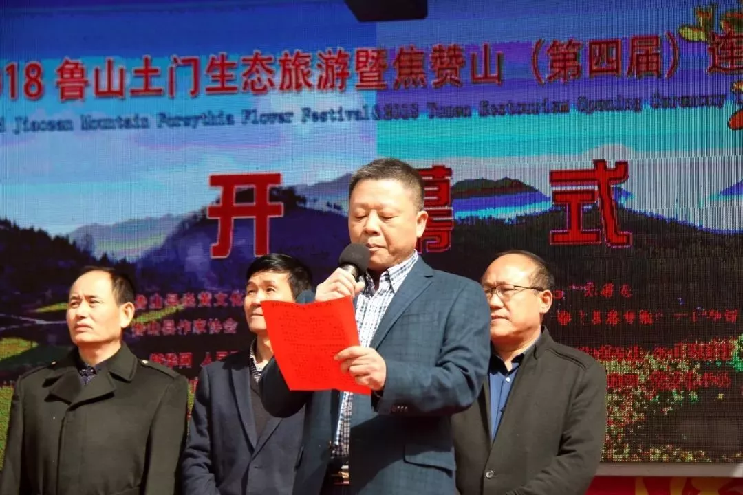縣委常委、縣武裝部政委張旭宣布“2018魯山土門生態(tài)旅游暨焦贊山(第四屆)連翹花節(jié)”開幕?。?/p>