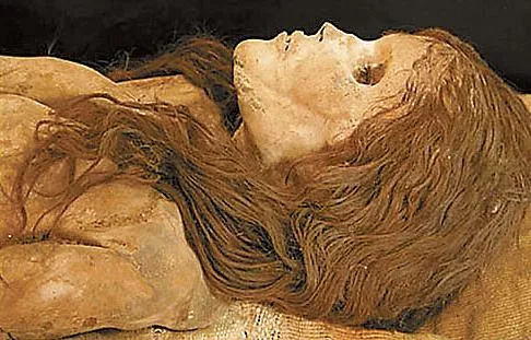 其中有一個船型棺材,打開棺材一看,里面有一具完好無損的古尸。嚴密的裹尸布一碰就碎成粉末。揭開面部的腐布竟然是一個年輕的女子,雙目緊閉,嘴角微翹,就像是睡著了一樣。這具沉睡了2000年的不腐女尸就是傳說中的樓蘭女王,也有說是樓蘭公主。