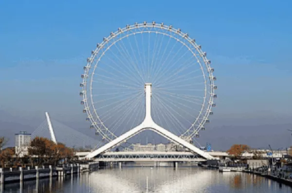 全稱天津永樂橋摩天輪,直徑為110米,輪外裝掛48個360度透明座艙。跨海河連接河北區(qū)與紅橋區(qū),是一座跨河建設(shè)、橋輪合一的摩天輪,兼具觀光和交通功用。天津之眼是亞洲唯一建在橋上的摩天輪,是天津的地標(biāo)之一。