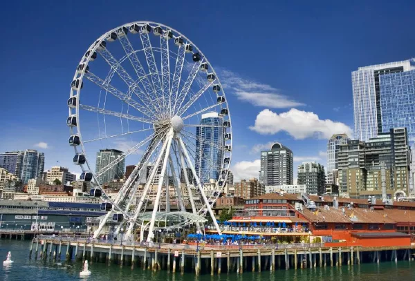 西雅圖摩天輪是美國西海岸最大的觀光摩天輪,直立高度有175英尺。它全年開放,擁有全封閉的座艙和一個有屋頂?shù)牡却齾^(qū)域;就算是下雨也不能阻止摩天輪的運(yùn)轉(zhuǎn)。這是一個絕佳的從高處觀賞西雅圖方法。