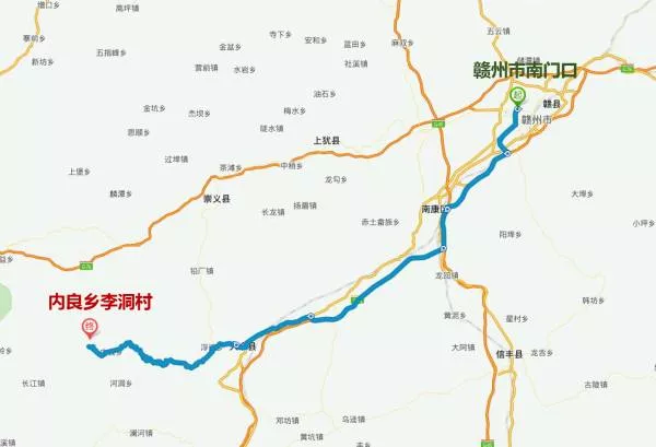 自駕游路線:贛州市南門口——贛州繞城高速——大廣高速——康大高速——G323——伯堅大道——南安大道——西華路——S230——李洞村
