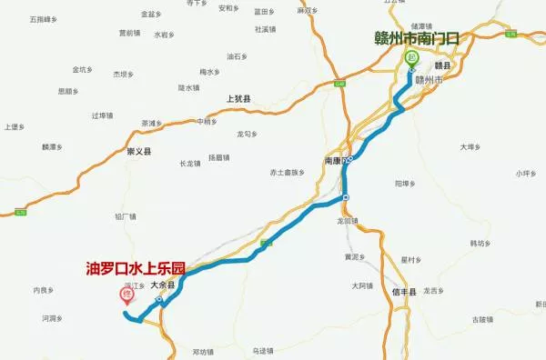 自駕游路線:贛州市南門口——贛州繞城高速——南康南樞紐——大廣高速——康大高速——S323——油羅口水上樂園