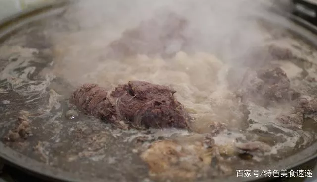廚房有三口大鍋,這三口大鍋從不熄火,這三口鍋是為早中晚三頓飯準備的,晚上熬的湯,是為早餐準備的,上午熬的湯,是為中午準備的,下午熬的湯,是晚上這頓飯用的,如此循環(huán)往復,從未中斷鍋,大叔說,他家的牛肉湯中間從不兌水,不管什么時候來喝,味道是一樣的。