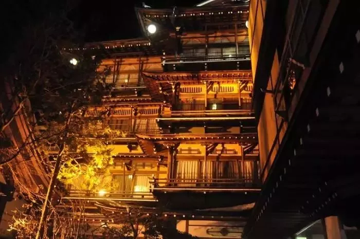前面說到油屋原型其實(shí)參考了很多溫泉旅館,其中就有涉溫泉金具屋。到了夜間這里四處洋溢著橘黃色的燈光,把整座建筑物映襯得金碧輝煌。