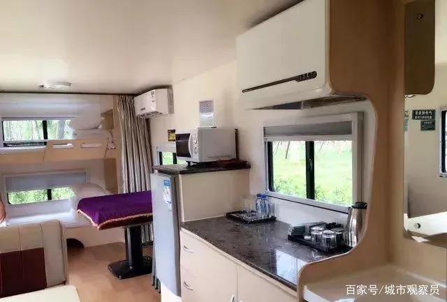 每輛房車?yán)锒紳M足一家四口的入住標(biāo)準(zhǔn),配備了雙人床、高低鋪、沙發(fā)、空調(diào)、電視、網(wǎng)絡(luò)、洗手間,另外還有微波爐和冰箱等,可以在里面做一些簡單的食物。