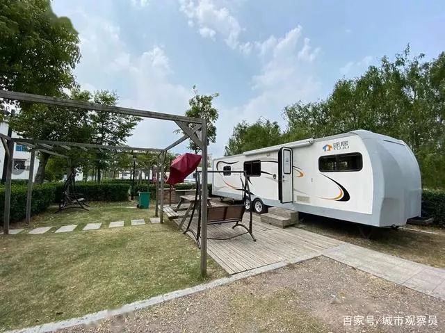 房車外部長9米,寬兩米,每輛房車都擁有獨立的戶外空間,如小車停車位、休閑平臺、燒烤臺等。
