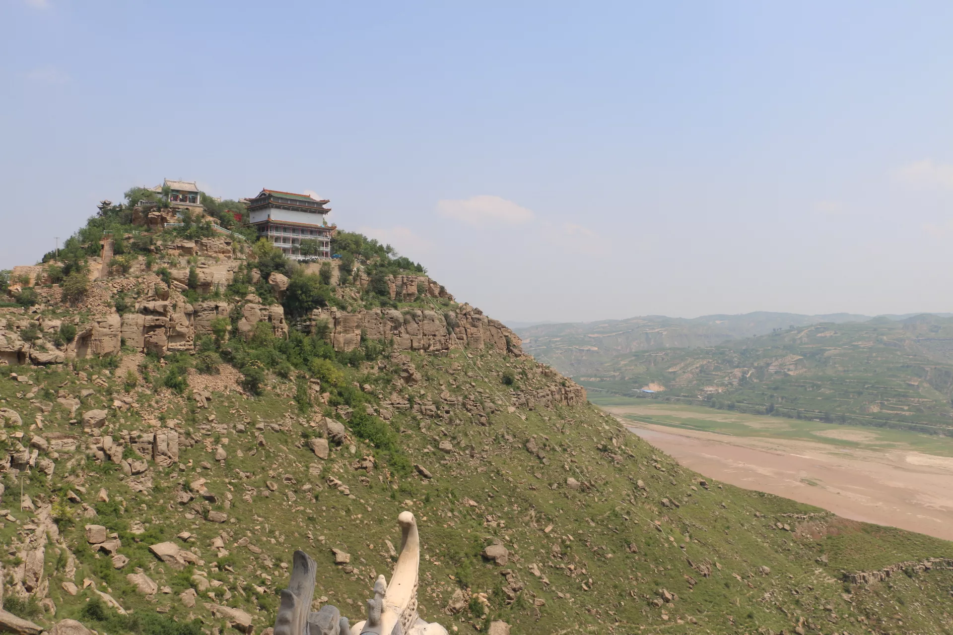 此山挺拔俊秀,北連數(shù)百里群山,南延五里是窟野河與黃河的交匯處,東面陡峭的山崖下是洶涌澎湃的黃河,西面滾滾的窟野河水由北向南擦山腳而過(guò)。據(jù)道光《神木縣志》記載“前有天然獅子石,甘霖地,復(fù)有仙橋,絕似天臺(tái),故名?!?/p>