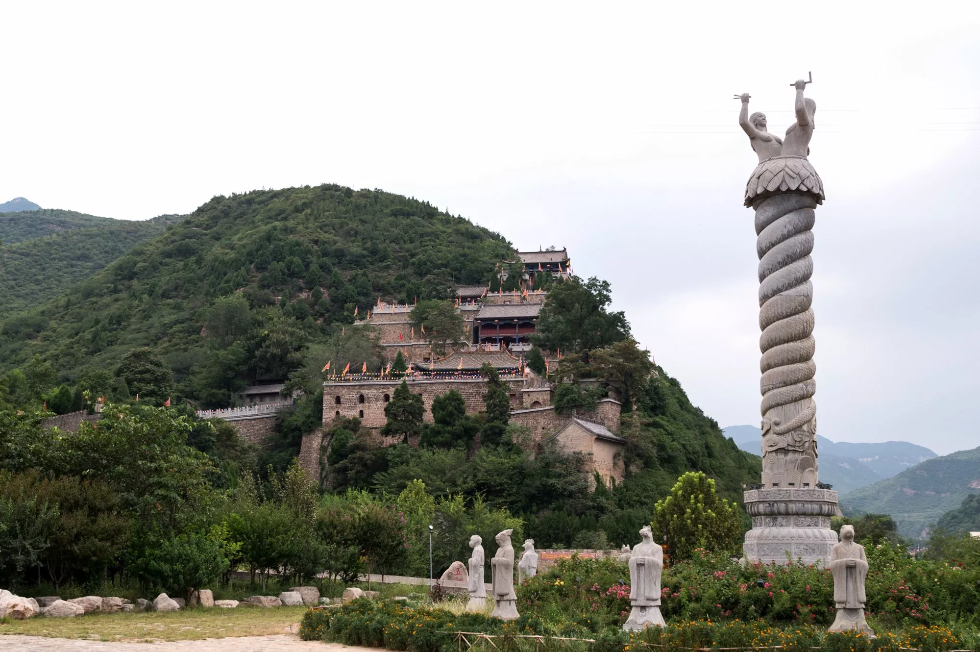 云丘山除了山上道觀較多外,在山腳下也有多處道觀廟宇。其中有一處位于中和廣場(chǎng)附近的五龍宮,中和廣場(chǎng)也是景區(qū)的入口處的一個(gè)廣場(chǎng),在廣場(chǎng)內(nèi)鼎立有一高達(dá)9.95米的柱子,寓意九五之尊,柱子直徑2.4米,寓意二十四節(jié)氣。柱子上刻有巨型石雕,是伏羲和人首蛇身的女媧交尾雕塑,表達(dá)了人類繁衍的淵源,這里也是伏羲觀天測(cè)時(shí)的一個(gè)觀測(cè)點(diǎn)。去八寶宮可以從中和廣場(chǎng)乘車前往,到達(dá)后在道路中間可以看到被保護(hù)起來(lái)的石