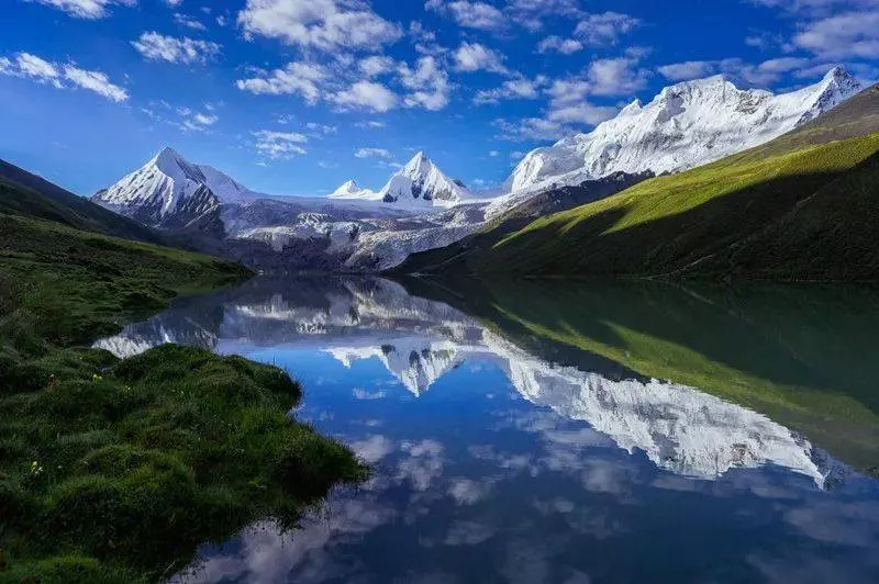 薩普神山海拔6956米,冰川經(jīng)過千萬年來的亙古蠻荒,峰頂皚皚白雪終年不化。雪水化作的湖泊空靈娟秀,四周簇?fù)矶鴣淼谋ü夤株戨x。冬季,湖泊凝結(jié)成一面藍(lán)色冰晶;到了仲夏時(shí)分,湖面翠色欲流,波平如鏡,倒映著藍(lán)天、白云、冰川和雪峰,湖畔花紅草綠,水草豐茂,三兩只牦牛悠閑漫步于野草水波之上。