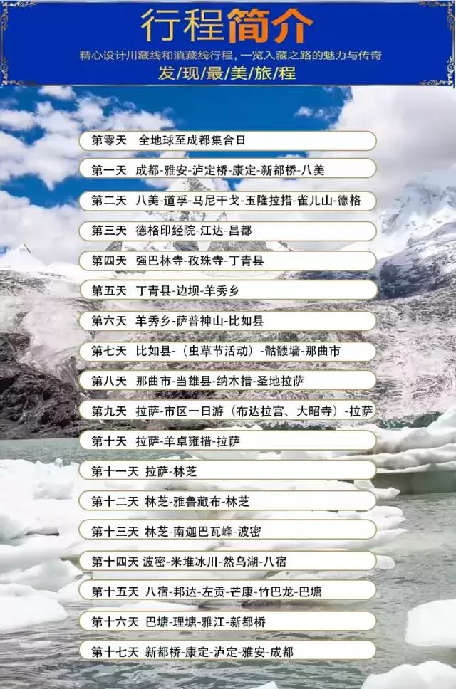 朝圣·天路你計(jì)劃去西藏嗎?317or3182019年7月18日一起出發(fā)報(bào)名電話:0833-2278777雄奇壯觀的雪山,原始茂密的森林,寧靜遼闊的草原,絕美靜謐的海子,雪山映襯的藏寨、悠揚(yáng)激蕩的牧歌......一路向西,沿著被《中國國家地理》雜志贊譽(yù)為中國最美麗的景觀大道,探秘康巴文化核心區(qū)域,感受藏區(qū)的美麗風(fēng)景、文化藝術(shù)、民俗風(fēng)情、建筑藝術(shù),沿途我們