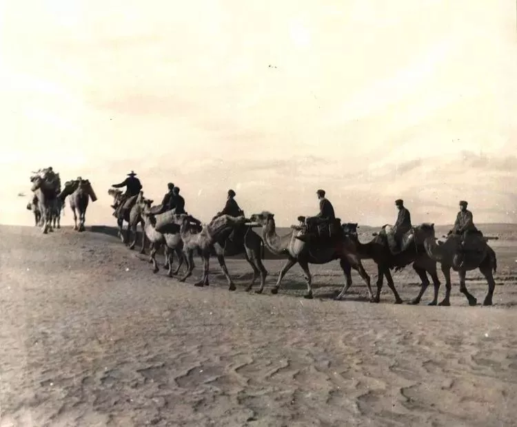 航測(cè)外業(yè)(包括野外控制測(cè)量和像片調(diào)繪),是航空攝影測(cè)量的重要環(huán)節(jié)。圖為1971年蘭州軍區(qū)第6測(cè)繪大隊(duì)在騰格里巴丹吉林沙漠地區(qū)執(zhí)行航測(cè)外業(yè)任務(wù)時(shí),技術(shù)人員騎駱駝向沙漠開進(jìn)。