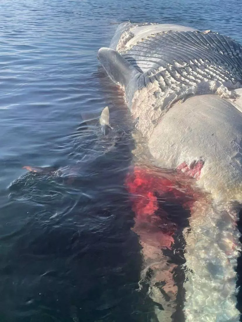 Jono Riley說(shuō),這條鯨魚(yú)在輪渡碼頭以東120米的地方“沉入海底”,吸引了這些兇殘且饑餓的海洋掠食者們。