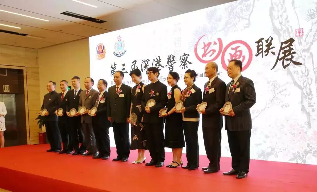 深圳市藍盾書畫協(xié)會會長劉耀良、香港警察書畫學會會長李雅麗代表兩地警察書畫團體互贈聯(lián)展紀念品,并共同為推動深港警察書畫藝術發(fā)展作出突出貢獻的代表頒獎。