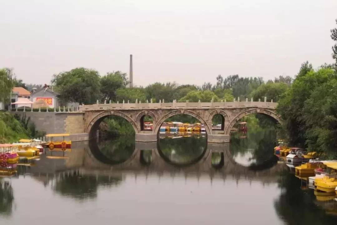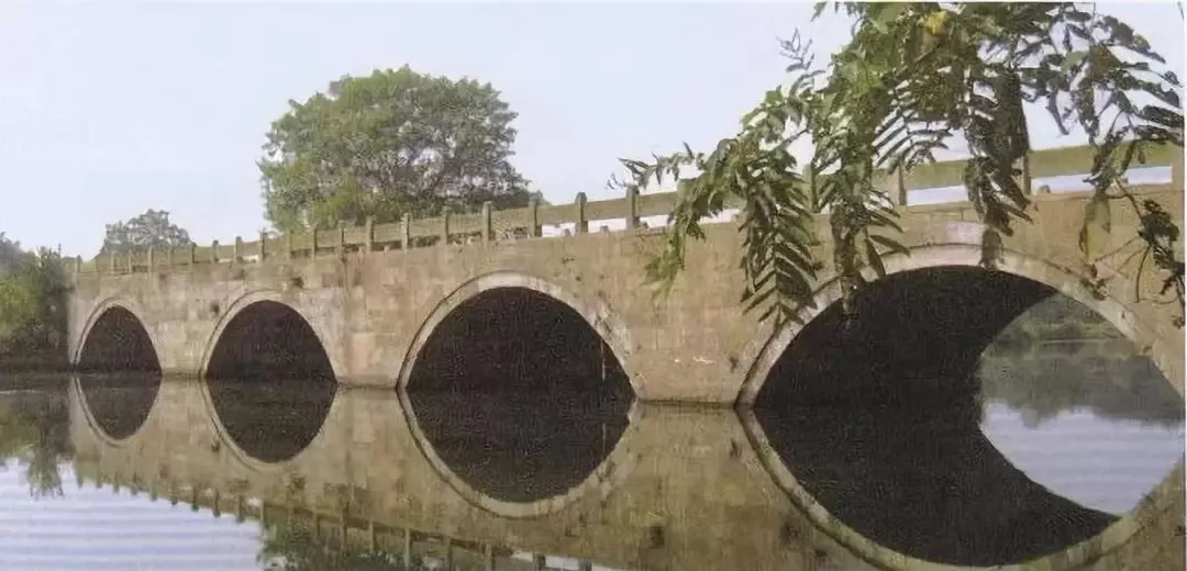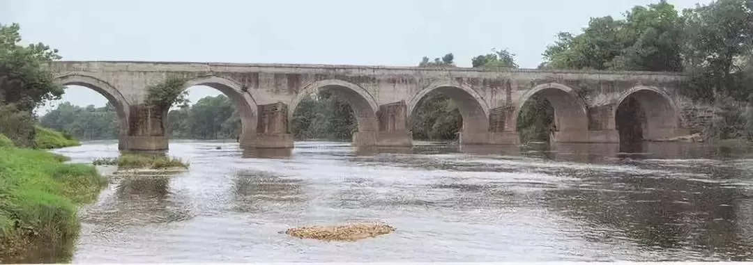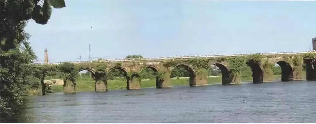 1933年,洪水沖毀南北兩孔,1935年修復(fù);1944年被日軍炸毀,1956年修復(fù)為8孔石拱橋。全長166.35米,寬10米,單孔跨徑15米。