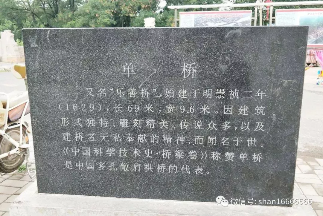 明崇禎元年,五節(jié)橋廢,邑人石守志、張九舒、楊起鳳、秦堡等人倡建新橋。適于建橋的松柏的木難以籌措,便毅然改建石橋。特聘曾建登瀛橋的建橋高士劉尚用為總設(shè)計,云游的裴道及義子王金也加入建石橋的行列。歷經(jīng)16載,終于建成五孔敞肩石拱大橋。初沿用五節(jié)橋名,旋改樂善橋,取建石橋的善男信女,以善為樂,樂善好施。急公好義之意。又稱善人橋,簡稱善橋,又因善字書寫較繁,再加上史書上曾名單橋,又改成單橋。
