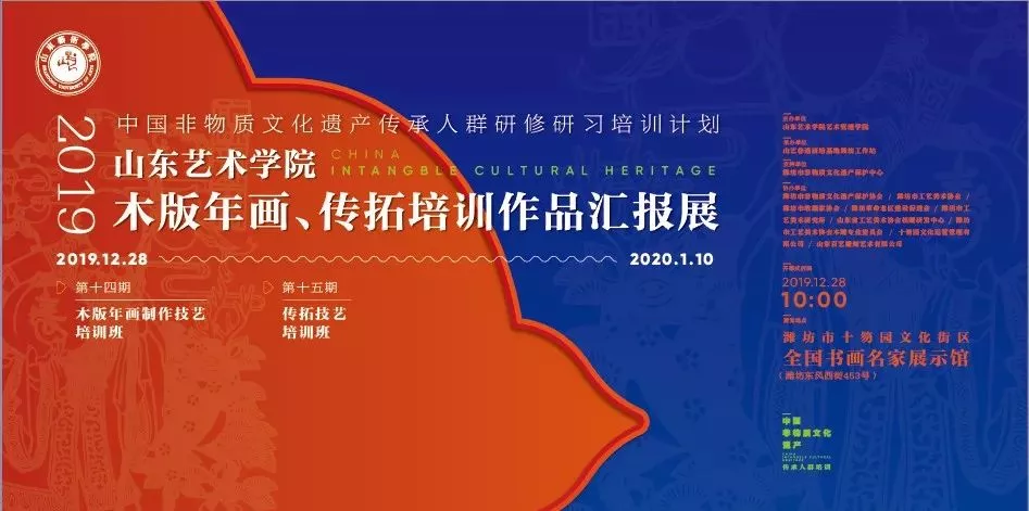 2019年12月28日, 由山東藝術(shù)學(xué)院藝術(shù)管理學(xué)院主辦,山藝非遺研培基地泰安工作站承辦,濰坊市非物質(zhì)文化遺產(chǎn)保護協(xié)會、濰坊市工藝美術(shù)協(xié)會、濰坊市收藏家協(xié)會、濰坊革命老區(qū)建設(shè)促進會、濰坊十笏園文化運營管理有限公司、濰坊市工藝美術(shù)協(xié)會專業(yè)委員會、濰坊市收藏家協(xié)會核雕收藏專委會、山東省百藝雕刻藝術(shù)有限公司協(xié)辦的“ 中國非物質(zhì)文化遺產(chǎn)傳承人群研修研習(xí)培訓(xùn)計劃山東藝術(shù)學(xué)院2019木版年畫、傳拓培訓(xùn)作品匯報展” 將在十笏園文化街區(qū)全國書畫名家展示館隆重開幕!