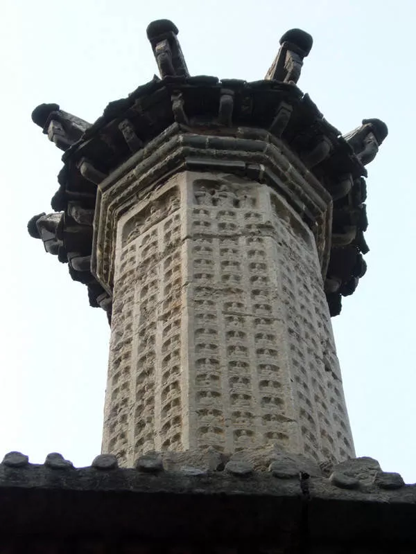 彼岸寺的石刻經(jīng)幢,通高12.18米,由底盤、腰臺基座、篆文碑、造像柱、塔幢頂部共五個部分構(gòu)成。
