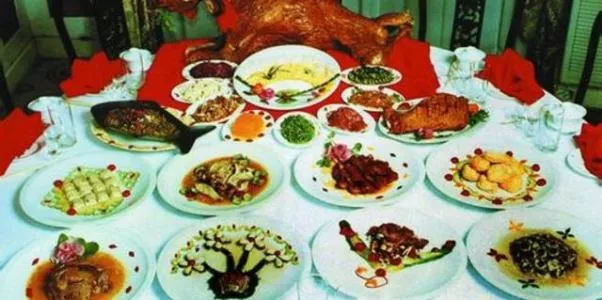 扣麒麟頂為全羊席之首菜。將羊頭燙毛刮凈,下鍋煮熟,撈出取骨取舌,使羊臉和下顛肉保持完整,不變形。將羊臉肉用醬油上色入味,炸成金黃色,放入碗內(nèi),將羊眼(挖去黑眼珠)放在眼窩內(nèi),將羊舌片按原形放在羊臉肉上面,再將下頦肉按原形壓在羊嘴周圍,仍是完整的羊頭形狀。然后加入食鹽、醬油、花椒水、蔥段、蒜片、姜末、八角一顆,上籠用旺火蒸爛取出,揀去調(diào)料,將羊頭完整地翻扣在凹盤內(nèi),使羊臉壓在下頦上,羊嘴銜一根香菜,梢部露在嘴外,盤的四周放一些發(fā)菜,蘿個(gè)刻的紅菊花和-花。這道菜,色澤金黃,五彩繽紛,頭形完整,吃起來香爛適口。