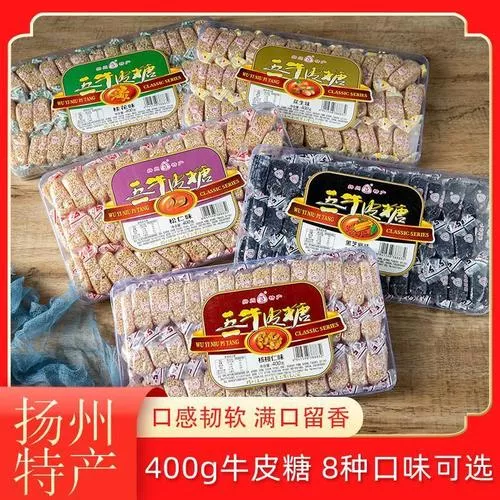 牛皮糖號(hào)稱揚(yáng)州特產(chǎn),目前有核桃味;桂花味;花生味;松子味;提子味;金桔味;草莓味;香橙味和哈密瓜味,新的口味更加獨(dú)特,柔軟適中,老少皆宜。