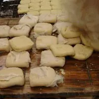 發(fā)多先要選取當(dāng)年新割的飽滿黃豆,淘凈砂土,置入溫水中浸泡一夜,至少10個小時,讓它吸足水分、漲得鼓圓。然后把浸泡好的黃豆細(xì)細(xì)研磨成濃漿,把濃漿和三倍溫水倒進鐵鍋內(nèi),文火慢煮,沸騰時要加入少許涼水,使它不會漫出鍋外。持續(xù)煮上二十來分鐘,待豆?jié){熟透稍濃了,將漿裝入細(xì)紗巾縫成的白袋中,濾凈豆渣。再把濾過的豆?jié){置入大木桶,加入適量的鹽鹵,讓它凝結(jié)成豆花,就可分裝入小白布包扎緊,加上木板輕壓,發(fā)酵的同時又瀝去大部分水分。待差不多五成干時,將它一一翻個身,置入木模;木模板上,還要逐漸加上石塊,使水分盡量瀝干。解開小包后,粉嫩白皙的布包豆干,便如鄰家少女初長成,惹人喜愛讓人憐了!