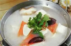 4、燒熱鍋,放開水和凍豆腐,燒滾后,倒入漏勺,瀝去水分;熱原鍋,去水下入豬油、蔥、姜末熗鍋,烹黃酒,加肉湯、夾心肉塊,煮熟后取出,切成長4.5厘米、寬1.5厘米的薄片;將黑魚頭、脊背骨放入原湯中,燒滾15分鐘,即用漏篩濾去魚渣,棄之不用,再放香菇、肉片、海米、魚片、凍豆腐塊、冬筍片,燒滾后,撇去浮沫,加鹽、味精、黃酒,倒入火鍋內(nèi),最后放塔菜心,即可上桌,點燃火鍋食用。