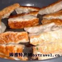 油煎鍋貼一種是帶餡,一種無餡。大小約為水餃的兩倍。餡可以隨自己的喜好調(diào)制。一般是豬肉(芹菜肉、蘿卜肉)或素餡(白菜豆腐、素三鮮)等等。包好后一個個貼到熱油鍋里。在加熱的過程需要翻動幾下。無餡的鍋貼為長條形。是將面搟成皮,抹上油鹽蔥,卷成條狀,然后扭一下。做好后同有餡鍋貼一樣放到鍋里煎熟。剛出鍋的鍋貼最好吃,香噴噴的,看著熱油還在上面沒有完全退去。忍不住咬一口,雖說有點燙,但是香香的夠滋味的美味已經(jīng)到了嘴中……