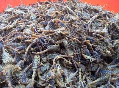 全蝎亦稱蝎子、全蟲,屬鉗蝎科節(jié)肢動(dòng)物。完整的蟲體長(zhǎng)約6厘米,表面呈甲殼狀,主體呈扁平橢圓形,長(zhǎng)約3厘米,寬約1厘米,產(chǎn)于青州、臨朐等地。載:“蝎出青州,形緊小者良”。五代、唐、宋時(shí)期臨朐屬青州轄區(qū),因而通稱“青州全蝎”。清初外省商人就到青州、臨朐大量購蝎子,因而中有“蝎客”的故事。全蝎既屬地道名貴藥材,也是餐桌上的名貴佳肴,在國(guó)內(nèi)外享有盛譽(yù)。全蝎多穴居,晝伏夜出。捕捉以清明至谷雨時(shí)最宜。夏秋捕的秋伏蝎,南次于春蝎。將活蝎倒入清水中洗凈,然后在鹽水中浸36小時(shí),撈出,將鹽水放入鍋內(nèi)燒開,再次蝎子倒入壓實(shí),煮4小時(shí),待蝎體僵硬時(shí),撈出晾干即可食用。將全蝎在溫鹽水中浸泡,再用香油慢火烹炸,即可食用。香酥可口,味道鮮美,奇香妙不可言,為風(fēng)味獨(dú)特的佳肴。全蝎含有三-、甜菜堿、牛黃胺、軟脂酸、硬脂酸、孵磷脂及胺鹽等成分,常用有舒筋活血、防風(fēng)除濕、通絡(luò)止痛、解毒強(qiáng)身之功效,營(yíng)養(yǎng)價(jià)值極高,倍受人們喜愛。