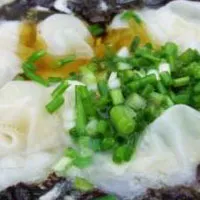 3.鍋內(nèi)放清水,燒沸后,將餛飩生坯下鍋,用鐵勺背部靠著鍋邊和鍋底輕輕推動,以防餛飩粘在一起。待餛飩浮起后,加些冷水再煮片刻隨即撈起盛入碗內(nèi)(碗里事先放好鮮湯和豬油)。