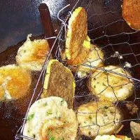 炸蝦餅,絕對(duì)是吳川的一大特色。在外地是很少可以吃上這么正宗的傳統(tǒng)小食。由于吳川盛產(chǎn)大蝦,海產(chǎn)品特別豐富,據(jù)說當(dāng)年發(fā)明者的靈感、構(gòu)思就是來自吳川豐富的海產(chǎn)品上。吳川的炸蝦餅制作很簡單:米粉加蔥花調(diào)糊,用小鐵器盛裝,再加幾條鮮蝦,然后放進(jìn)油鍋炸至金黃色即撈起,配以少量椒鹽、一片生菜,香味誘人。吳川炸蝦餅最大的特色是餅香、脆口、好味,并夾帶著海蝦的清香,味道讓人一嘗試難忘。