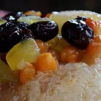 八寶飯歷史悠久。制作時(shí),先將糯米洗浸,涼干;煮熟蓮子、雞蛋、紅棗、連同“八寶”中的其他佐料在一只只空大碗里擺成花鳥等圖案;用豬油、豬腳湯等將糯米翻炒至九成熟后,下白糖、香油等,翻拌后裝進(jìn)碗中,中間放進(jìn)豆沙,然后將蒸熟糯米飯,再反扣在犬盤中,原大碗里的花鳥圖案就露在上面,這就是八寶飯。八寶飯香甜可口,兼具潤肺、補(bǔ)腎功能,所以老少咸宜。