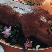 制作原料:小乳豬一只(3000克),精鹽200克,白糖100克,八角粉5克,五香粉10克,南乳25克,芝麻醬25克,白糖50克,蒜5克,生粉25克,汾酒7克,糖水適量。