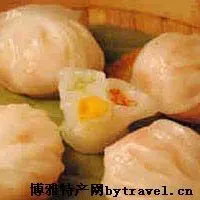 以燙面皮包裹肉餡蒸制而成。其色如蛋黃,皮薄,軟韌爽滑,餡嫩湯旺,以香醋佐食,鮮美而有醋酸和堿味的芳香。此品有數(shù)百年的歷史。《隨園食單》記述:“顛不棱即肉餃也,糊面推開,裹肉為餡蒸之。其討好處全在作餡得法,不過肉嫩去筋作料而已。余到廣東,吃官鎮(zhèn)臺顛不棱,甚佳,中用肉皮煨膏為餡,故覺軟美?!比馄れ懈啵慈缃竦呢i皮凍。拌餡時加入,遇熱即熔化為湯汁。以此法灌湯簡單易行,在廣東一直沿用至清末民初。30年代,廣州著名點心師把它改為豬皮凍中酌加瓊脂,或在夏天全用瓊脂,使湯汁既旺而又膩口。同時,又以蛋液、堿和面,擦至純滑作皮。這樣,可使其結(jié)構(gòu)緊密,質(zhì)爽滑而稍韌,能搟壓至較薄而不穿破,使灌在餡中的湯汁不致漏失。