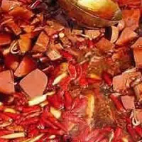 另有一種說法就是70年前,沙坪壩磁器口有一王姓屠夫每天把賣肉剩下的雜碎,以賤價處理。王的媳婦張氏覺得可惜,于是當街起賣雜碎湯的小攤,用豬頭肉、豬骨加豌豆熬成湯,加入豬肺葉、肥腸,放入老姜、花椒、料酒用小火煨制,味道特別好。在一個偶然機會,張氏在雜碎湯 里直接放入鮮生豬血旺,發(fā)現(xiàn)血旺越煮越嫩,味道更鮮。這道菜是將生血旺現(xiàn)燙現(xiàn)吃,遂取名毛血旺。