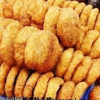 3、然后將糯米團(tuán)壓成餅狀,投進(jìn)滾油鍋炸成金黃色即可。YgQ