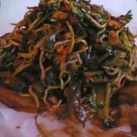食時先在米卷粉皮上依次刷上甜面醬、辣椒醬、西紅柿醬,然后放上涼面、酸蘿卜丁、折二根段、萵筍絲、綠豆芽、芹菜、海帶絲、芫荽段、蔥花、胡蘿卜絲、油炸黃豆再加上醬油、醋、味精、香油、花椒油包成春卷即成。
